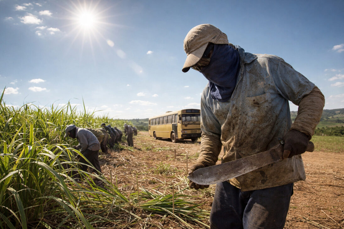 Colheita manual de café, corte de cana, trabalho no campo sob sol forte e calor extremo fazem parte da rotina.